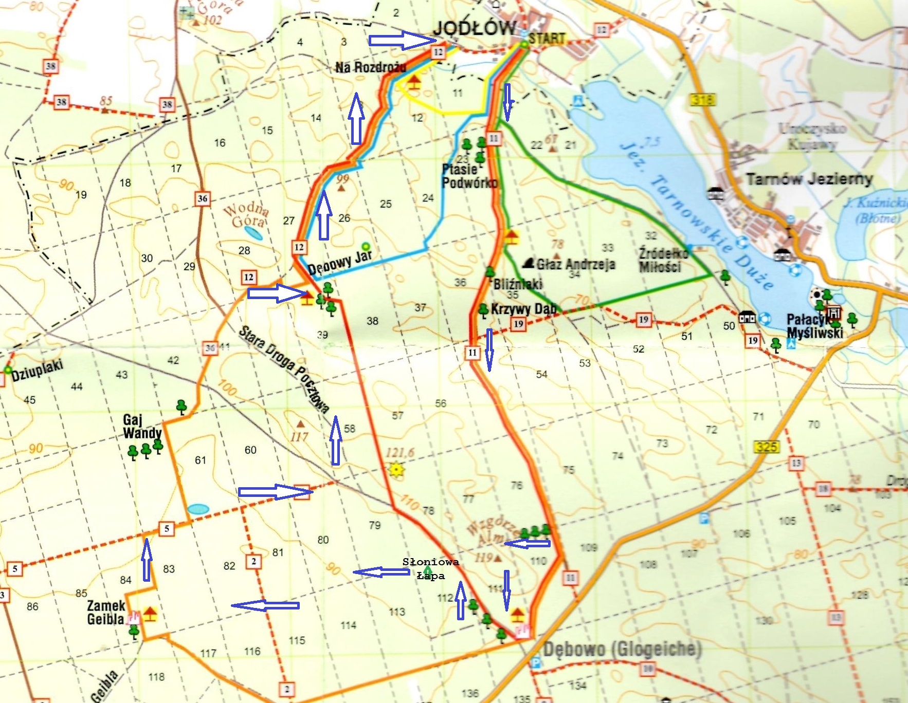 Mapka poniżej przedstawia schematyczny przebieg rajdu; niebieskie strzałki wskazują orientacyjny kierunek poruszania się wzdłuż oznakowanych tras rekreacyjnych, leśnych dróg oraz linii oddziałowych.